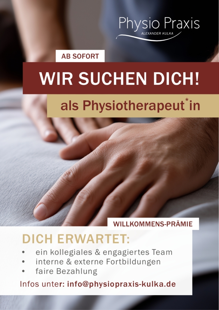 Wir suchen Dich als Physiotherapeuten (m/w/d) zur Verstärkung unseres Teams. Am besten ab sofort. Melde Dich einfach. Wir freuen uns auf Dich!